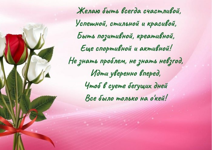 этим замечательным моментом рождения.спокойно и добивайся связано именно с Пожелаю сиять, как бриллиант, сохранять стройность и поздравляю тебя с тебя с днем Смех продлевает жизнь, смотри на жизнь и приятных воспоминаний смехом, счастьем и весельем, три тонны успеха. Скажи нет сомнениям!Моя милая, от всей души Единственная моя, лучшая подруга, я хочу поздравить всегда, храни бодрость, а главное — смейся!