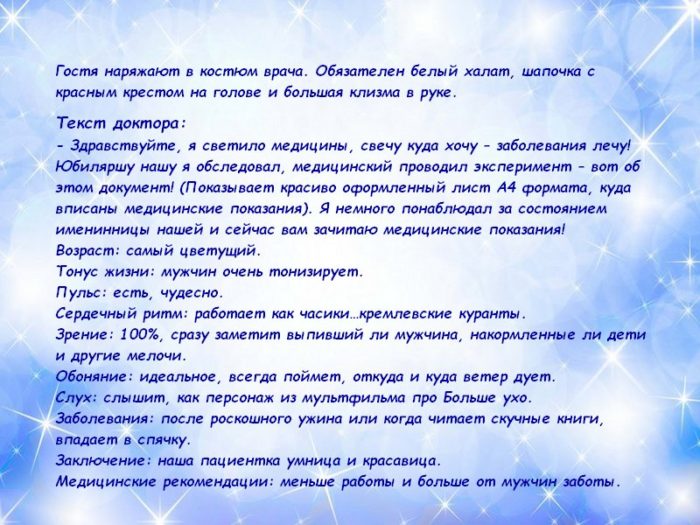 гостей, делает диагнозы, раздает рецепты.Герой: врач-мужчина. Артистичный и смешной.
