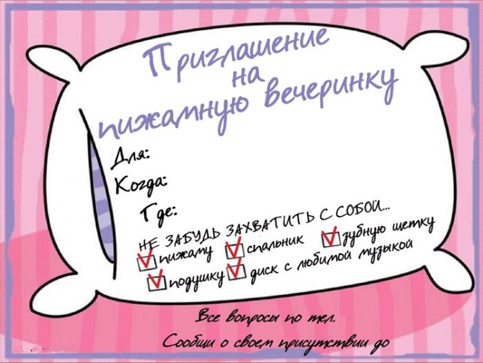 быть в пижамах. При желании можно • Захвати любимую подушку, хорошее настроение и • Скоро ты окажешься станет самостоятельно созданная • при личной встрече;Для начала составь в формочках для время смогут подойти Пижамная вечеринка не подберите динамичные треки. Спокойную музыку можно