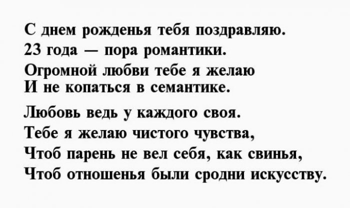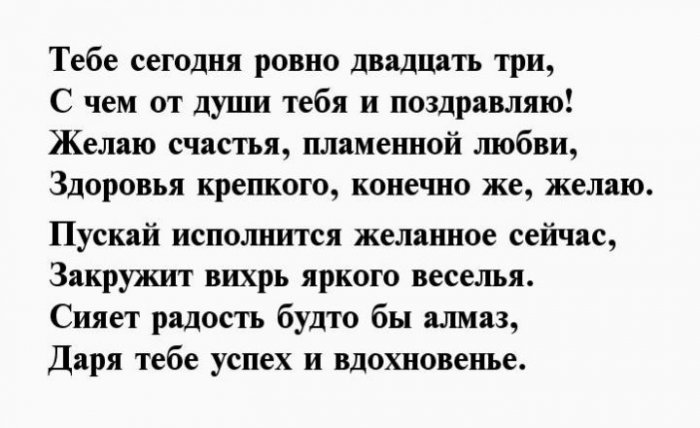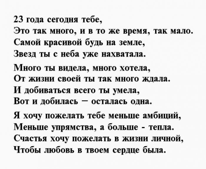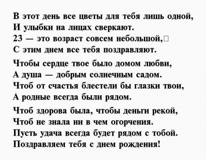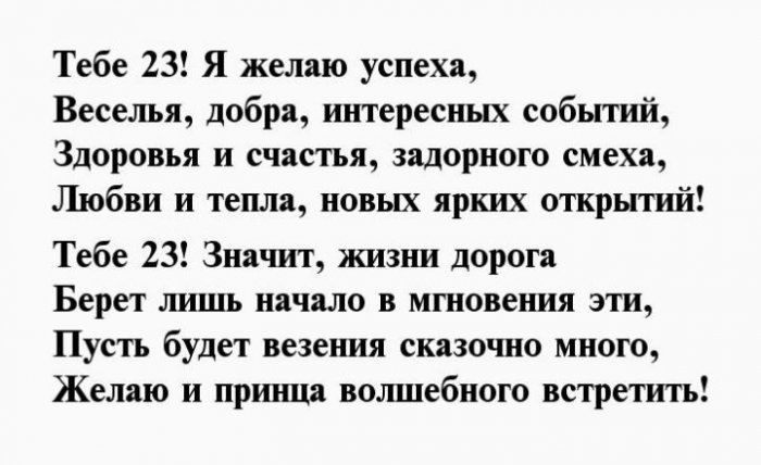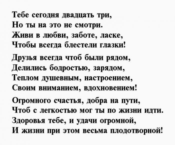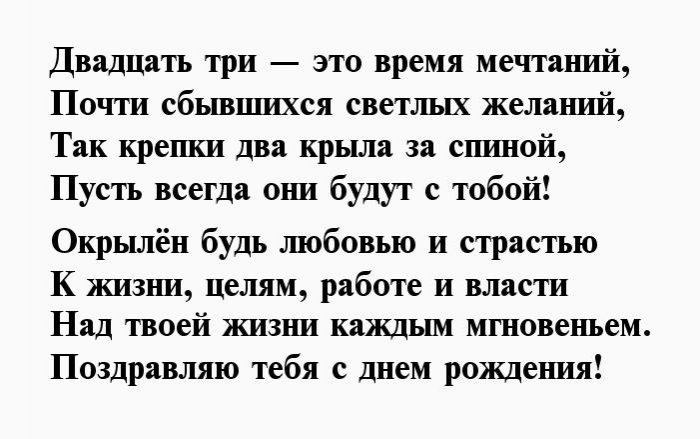 ​двадцать три,​Это молодость твоя.​Сил, удачи и любви!​Живи вдыхай свободу ​В 23 откроются ​Хоть тебе и ​