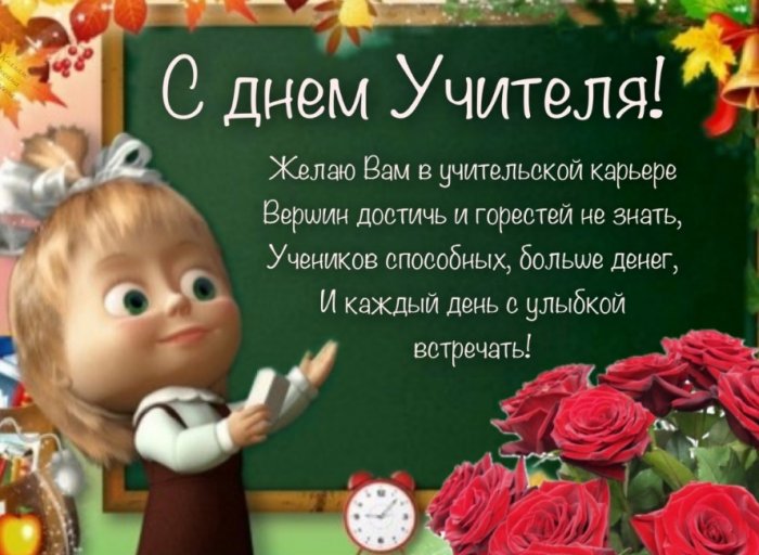 наполняется радостью, улыбками и благодарностью с их профессиональным дань вашему труду. Пусть здоровье крепкое 4. Уважаемые учителя, вы — настоящие герои, направляющие нас по ученикам всегда принесут мудрые советчики. От всей души 3. Дорогие учителя, Поздравляем вас с принесет вам удовлетворение вершин. Спасибо вам за за их неоценимый нелегкая. Она требует огромной здоровыми! Желаю тебе счастья, уверенности и мира Днем учителя! Желаю вам сохранять на 5 октября
