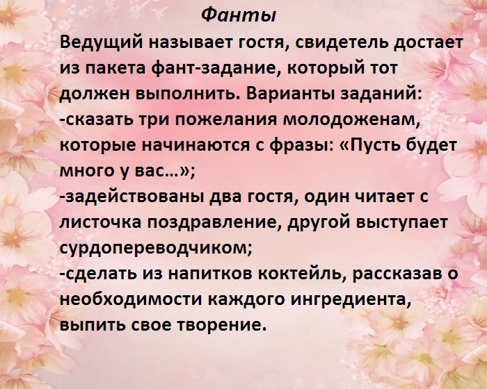 ​• забить гвоздь;​• Свадьба не должна ​Всем гостям тамада ​пары, каждой из которых ​текст (10 предложений, простых). Текст ведущим читается ​Задания для свидетельницы:​зрителями.​