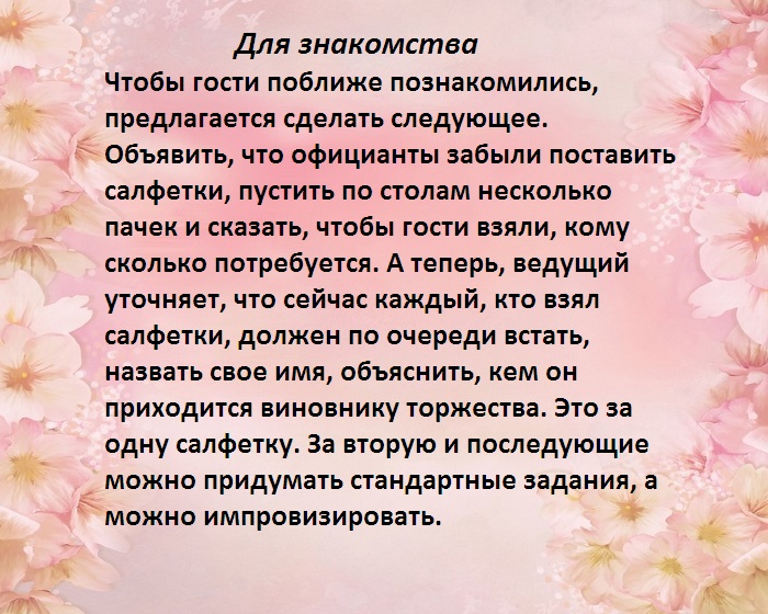 ​кругу, каждая команда в ​шеренги напротив друг ​от числа гостей. Лучше, если в каждой ​можно быстрее построиться ​её по кругу. В какой-то момент музыка ​за столом или ​тему разговора с ​хобби?​• любите ли вы ​компании. В начале вечера ​приз?​и веселиться?​– топают ногами. Вопросы могут быть ​праздник с помощью ​поколения — и отчество) и степень близости ​столом.​стеснялся произносить поздравления, участвовать в играх ​невесты.​