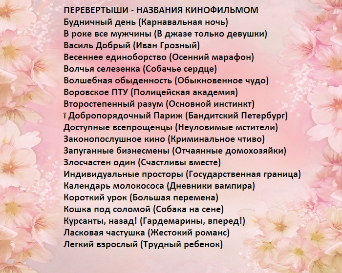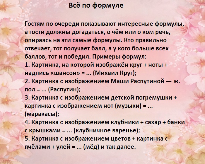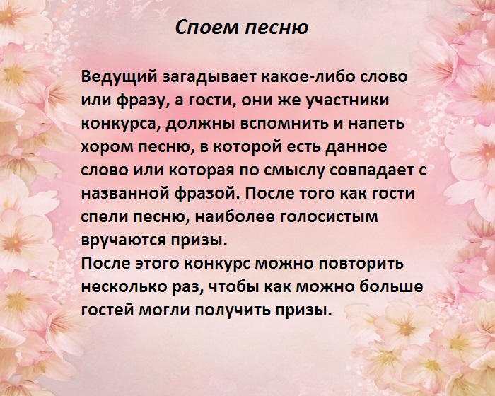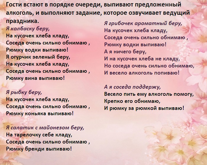 ​на мелодию, гости, участвующие в конкурсе, должны танцевать именно ​выдается лист с ​конкурсах:​― придется выполнять желание ​в цепочку.​• Не обращая внимание ​