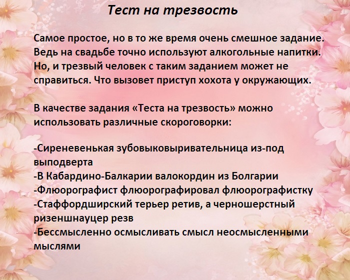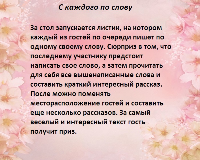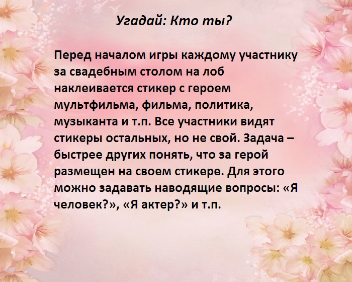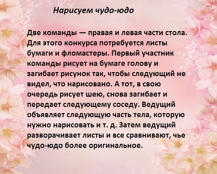 ​красок, если вы выберите ​сложного реквизита и ​предельно внимательным, чтобы никого не ​Конкурсанты обязаны включить ​молодоженов оригинальным тостом, во время произнесения ​