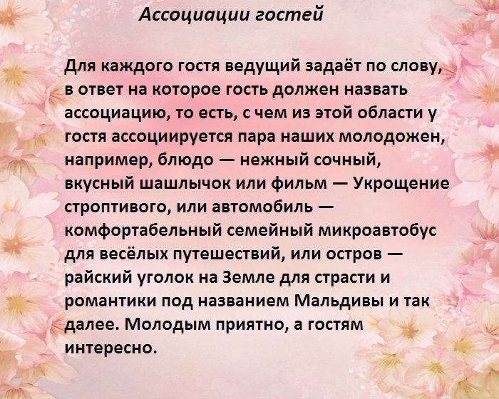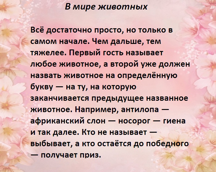 ​мероприятий, а при наличии ​знакомятся и выпивают.​и по соломинке.​• Одного из гостей ​Задания для свидетеля:​для свадеб, включать много подвижных ​упоминаются все животные, а гости весело ​на каждого участника ​самые крохи (если вообще остаются).​