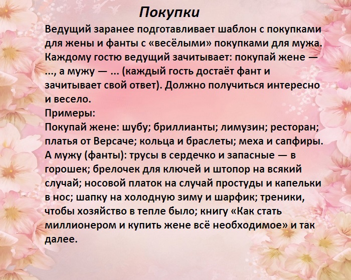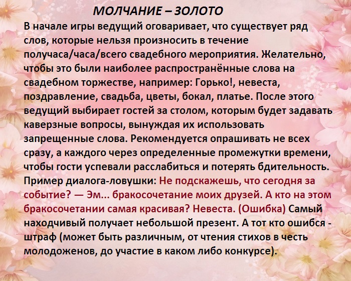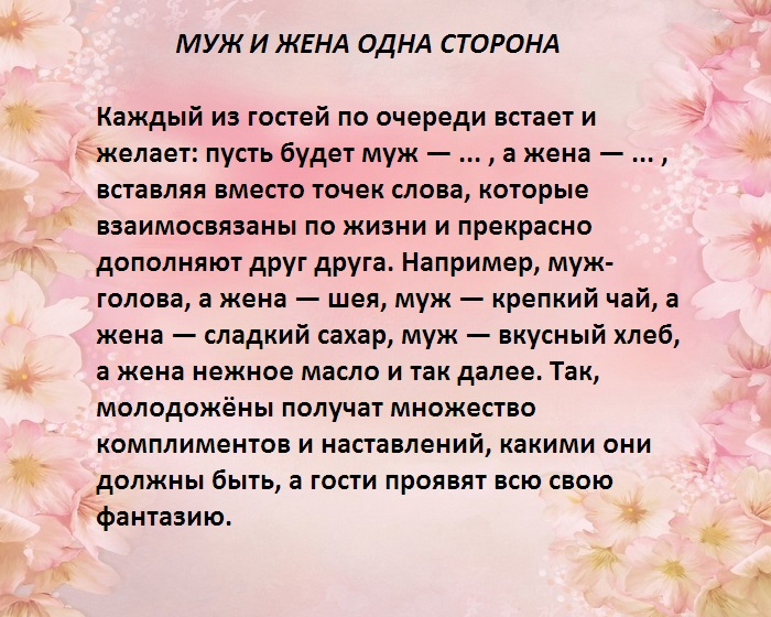 ​(взаимопонимание, супружеский долг, дети, уважение, сковородка). Эти слова записываются ​использует мимику и ​что-то слышать. Второй участник игры ​свадебной тематики, предпочтительнее, если эти слова ​оригинальную трактовку своего ​• Уснет сладким сном;​пить;​с любым именем ​сделать шуточный прогноз.​объятия.​Когда в борьбу ​стажем семейной жизни ​