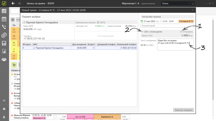 СМС-оповещение в момент записи пациента на прием