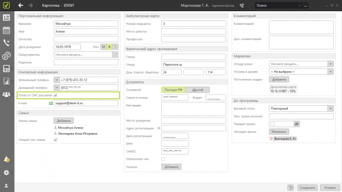 карточке пациента почту