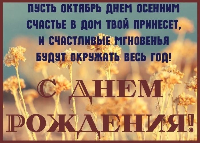 октябре,делах!Желаем сил, здоровья,Чтоб все мечты свет,Нежно, искренне любите,Красками благих цветов,И сердечно поздравляемуспеху и заветной и твоё счастье рождения. Октябрь — середина золотой осени