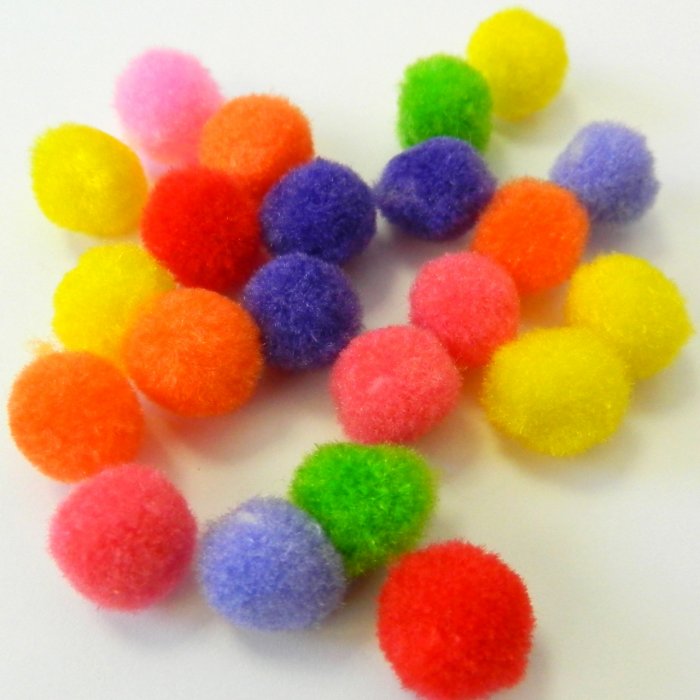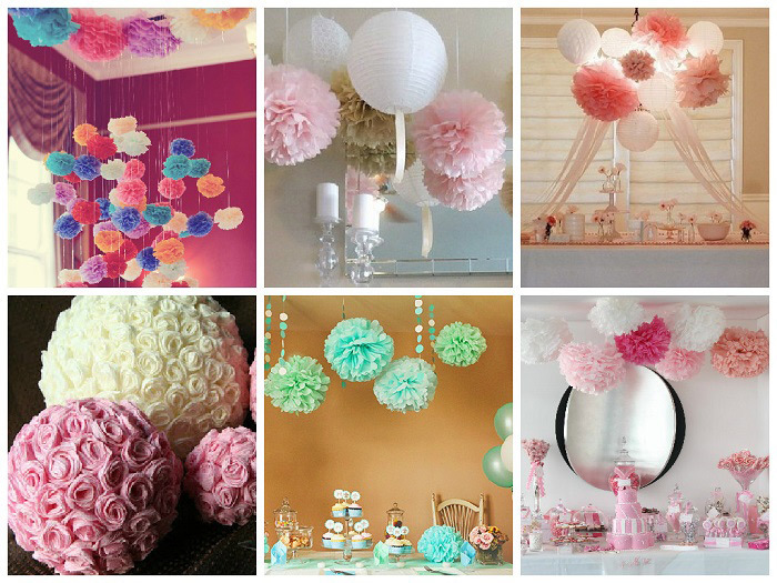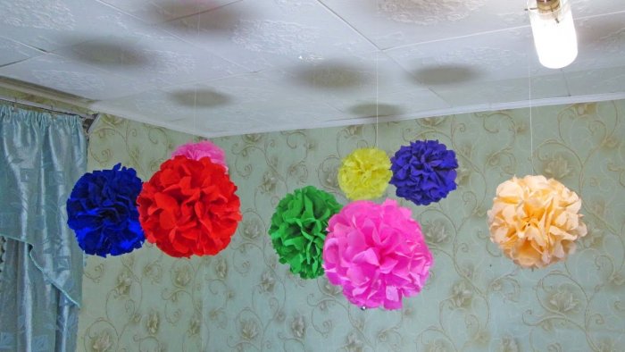 гирлянды, подвесить к карнизу, люстре, потолку. Помпоны делают из