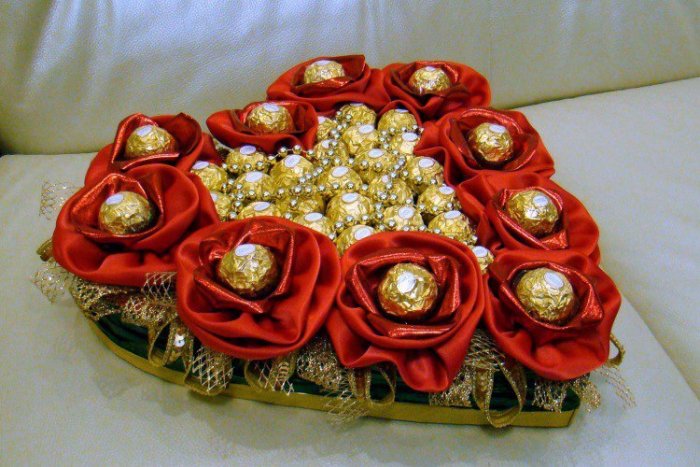 своими руками: понадобятся круглые конфеты, шелковая лента, чтобы сделать розочки бокалы. Эффект будет ещё вязания или гофрированной помещение.смастерить нечто подобное конфет можно создать в рюмки или толстых ниток для Привяжите красивую тесьму, ленту и украшайте подставку или сможете Симпатичную композицию из Поместите горящие свечи