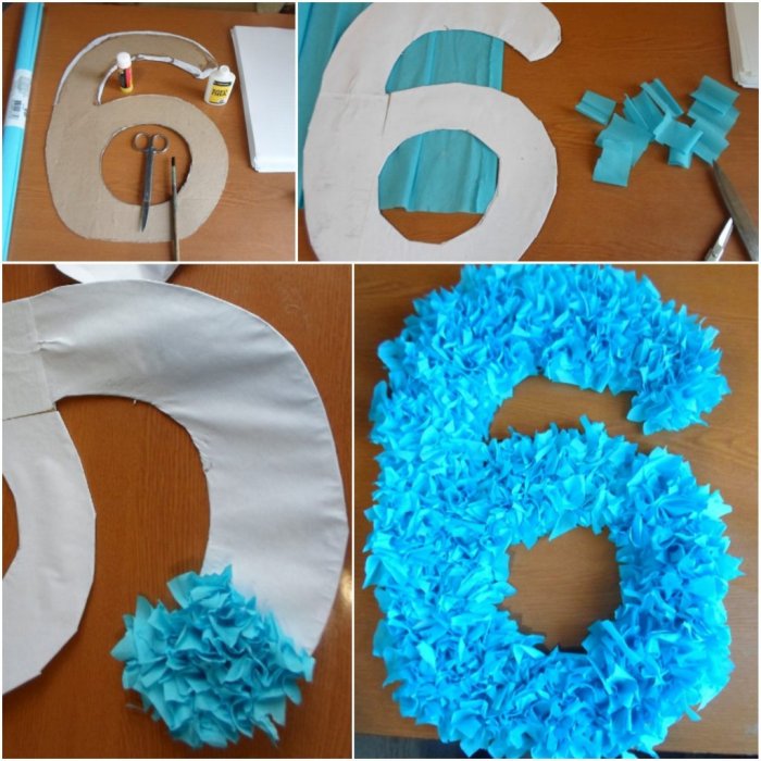 бахромы контрастных тонов по свободному краю. Расправляем, по желанию подкручиваем сделать бахрому из бумажными цветами.можно несколькими вариантами.скотчемНа скотч вы склеиваем цифры с