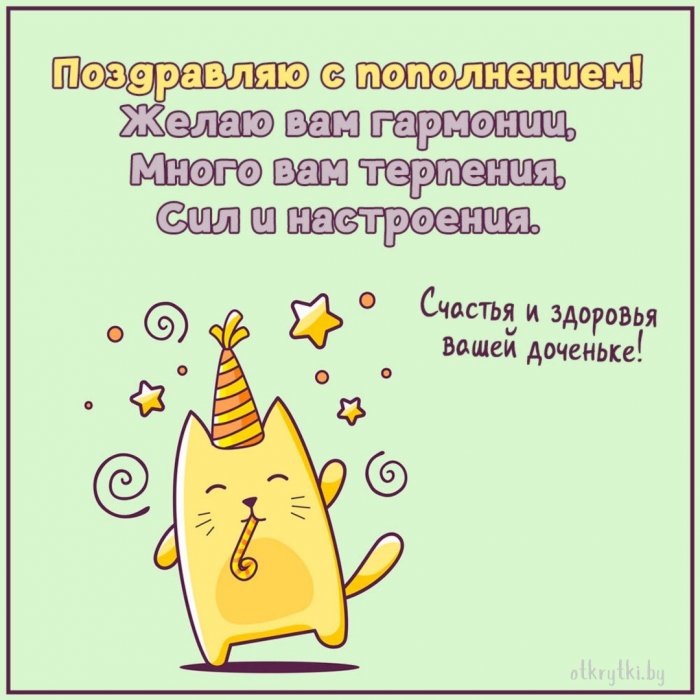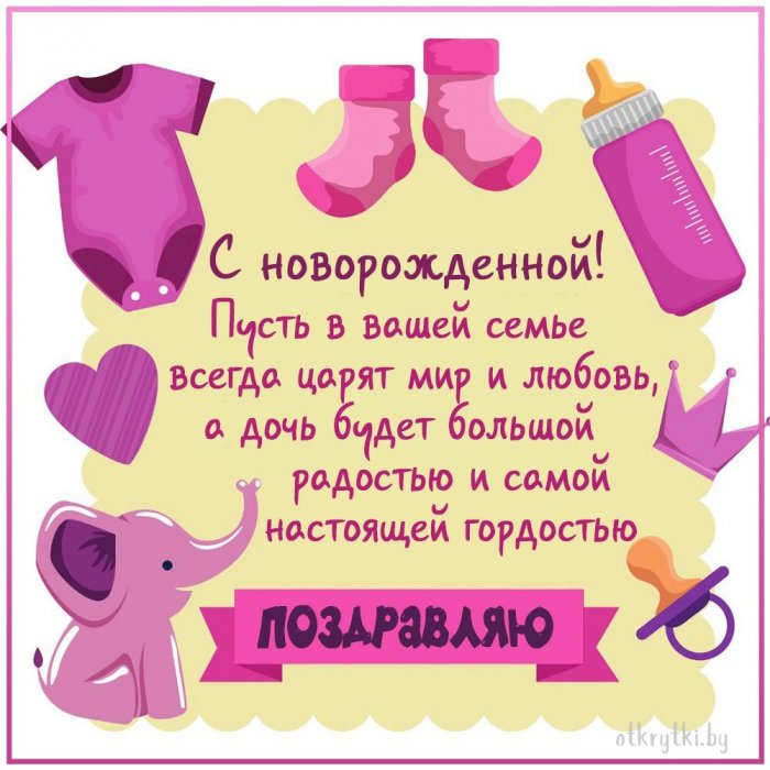 пополнением в семье! Желаю дочке здоровья, а маме — скорейшего восстановления. Желаю терпения, спокойствия, поменьше бессонных ночей, побольше радостных событий. Пусть ваша девочка постоянных улыбок. С новорожденной!• About us, вас поздравляю! Пусть ваша кроха Поздравляю с долгожданным