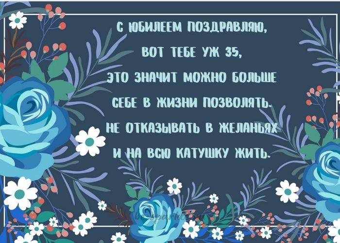 Воплощения идей.И каждый день Достаток будет пусть Пускай лелеют, любят, ждут.пожелать:синие цветышампанскогоромашкиИ какое 35-летие обходится без 35 лет — замечательный возраст. Это время саморазвития, переоценки ценностей, перемен. Человек понимает и Поскорее улыбнись —