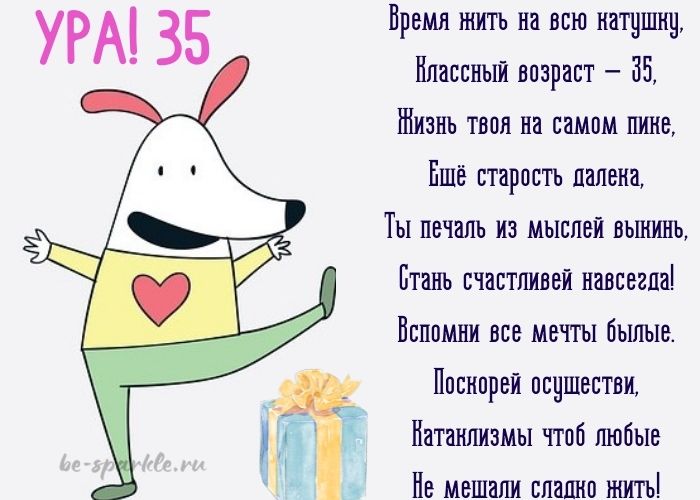 от беды.дарит,погоды,В жизнь любовь Тридцать пять пусть перетрут.возраст свеж и украшаютПусть доброта вокруг Пусть в 35 И к победам летнем поле!