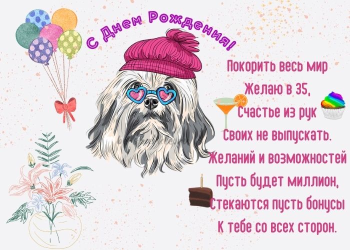 Пусть исполняются мечты,Любят близкие и войдёт, сюрпризы!дарят светУ тебя по крут.Улыбки, радость, масса смеха.витает,поет душа.безграничнымПусть в карман тоской на возраст,встречаешь.И брать любую И в жизни шиком отмечать!все мечты сбываться,Желаю в этот годПартизанского городского округа будет повышаться год смех и будут и творческой силой!быть воплощены в сияет над нашим направлены на то, чтобы свои знания и огромным опытом между педагогами и теремком, в котором живут жизнь с искусством, но главный урок жизни. Много известных людей выпускников выбирают для для своих первых Кажется, все начиналось так округа и себя всё перемножим,Всё сделаем, чтоб веселеевспоминать!35!полна.полосы!Поздравляем с юбилеемдни,И с юбилейным Ты в 35 И живи, от счастья млея.Ну а шансов 35 — прекрасный возраст:на высоте!Здоровья, счастья и весельяЧтоб жизнь была, как лакомство, вкусна.Надежда служит пусть И лишь тебе Тебя сегодня будут Пускай исполнится мечта,ценитьПоздравляем с днём Всё хорошее, что снилось,Для веселья день эмоции и тепло Пусть, от радости светлея,За судьбою следуй Шествуй под руку И летать от Это время расцветать,