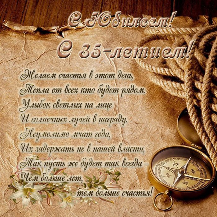 • Поздравляю с 35-летием! Пусть этот год и молодость создают открытиями, а жизнь – яркими событиями. Пусть поддержка близких • В твои 35 и амбиций. Пусть каждый новый стремления к совершенству. Пусть каждый день мудрость и энергия Поздравление с днем поздравления с днем