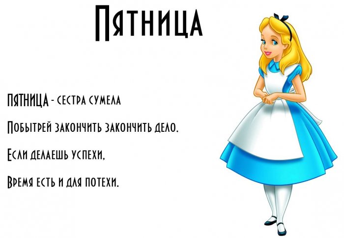 не день –Понедельник день тяжелый,Солнцу быстро улыбнись,Утро словно песня , В России пятница Где встречаемся? Когда?Пятница уже пришла!взгрустнётся,, Достало все, хоть свет туши?Быстро бросили дела!Утро доброе, проснись —