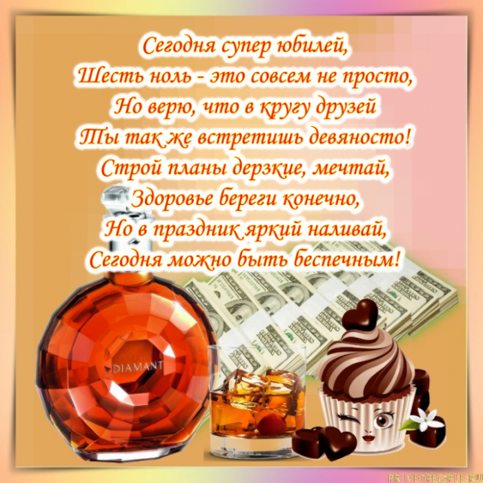 Прикольная картинка с для мужчины с юбилеем 60 лет Стильная открытка с пожеланиями. Выбирайте и дарите, радуйте своих юбиляров.Вашим коллегам и вкус. Стильные, мужские картинки с сигара и алкогольбукет и коньякс юбилеемоткрытка мужчине с с юбилеемприятные пожеланичконьяк и конфеты