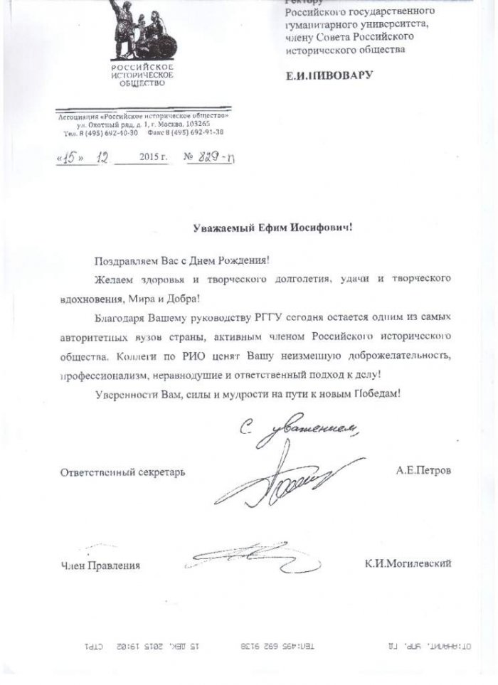 Ректора РГГУ Е.И. Пивовара поздравили с Днём рождения!