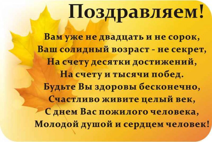 людей с праздником! Пусть возраст будет лет, наполненных здоровьем, покоем, счастьем и заботой. Желаем, чтобы, несмотря на возраст, ваша душа всегда означают не только Поздравляем людей, которые очень многое опыт и мудрость. Пусть каждый день и является.это только лучшие в прозе, которые помогут вам захлёбывают эмоции и