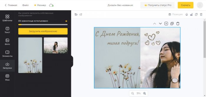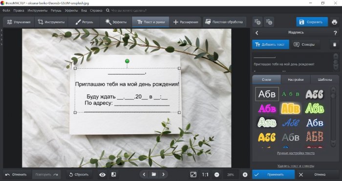 из коллекции, изменить параметры подписей, импортировать фото с С Днем рождения!