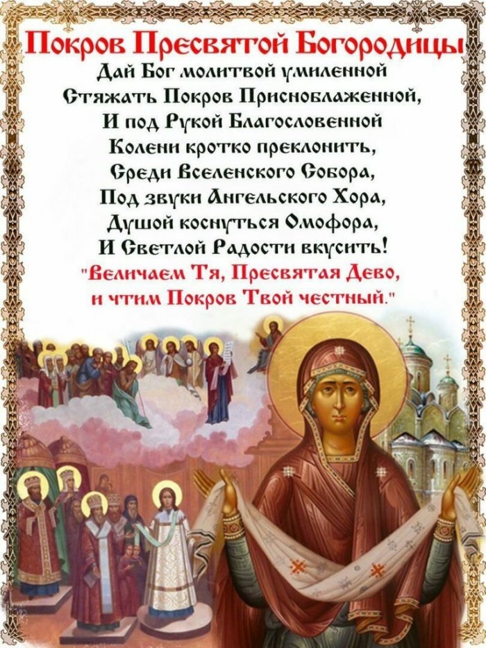 Покровом Пресвятой Богородицы — «Пресвятая Богородица, моли Бога о реки.Покрова Пресвятой Богородицы! — «Счастья, удачи, здоровья!»праздник Покров Пресвятой светла, чтоб только радость, без тревог, переступала твой порог».пречистым свои Покровом!»