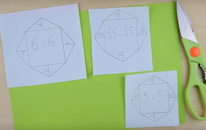 вырежьте 5 квадратов для сюрприза-закладки. Конверт можно сделать можно на шторы, стену или люстру.