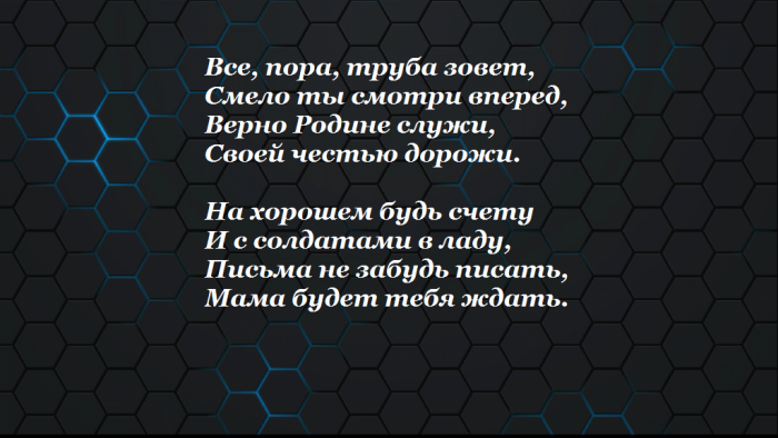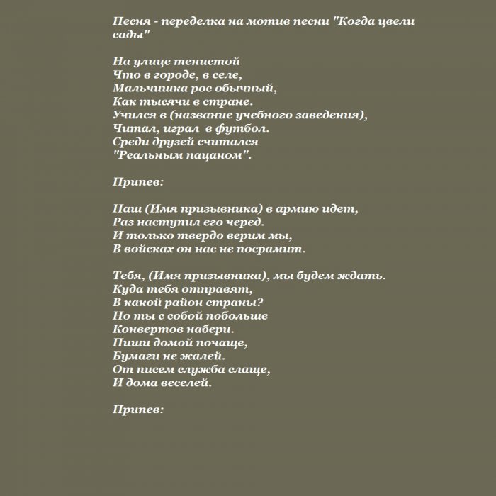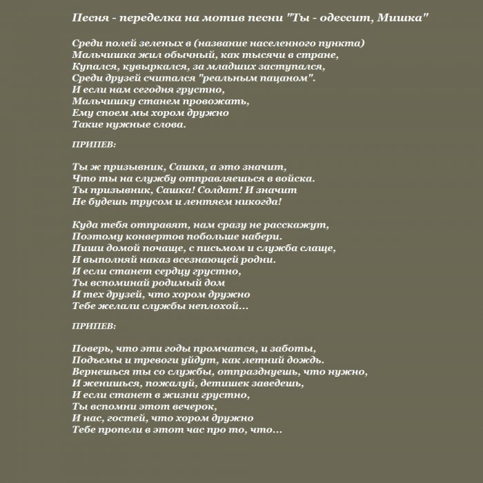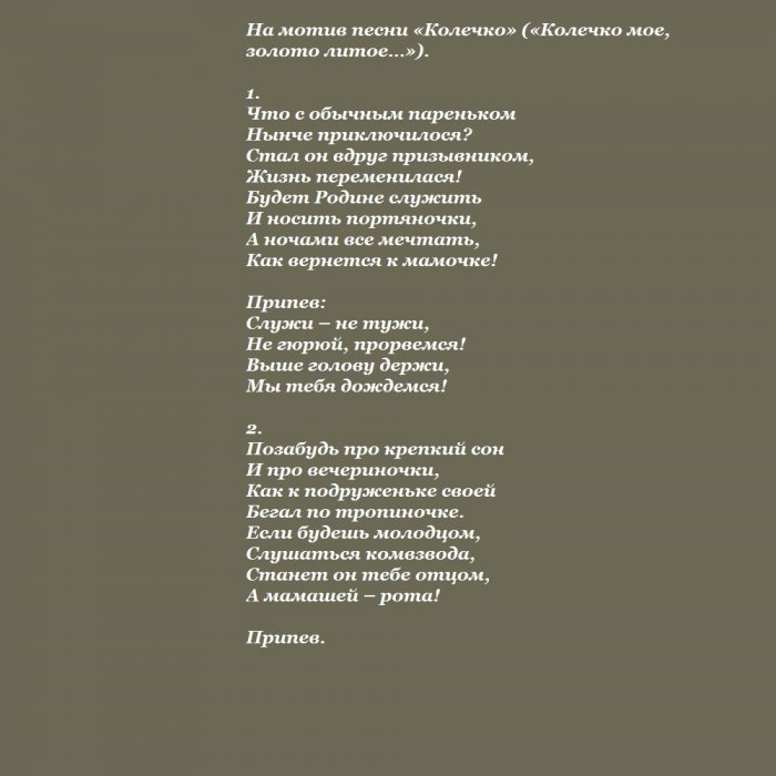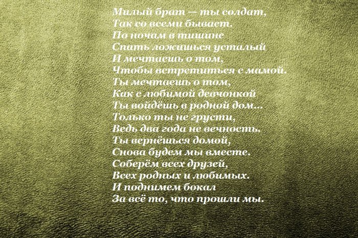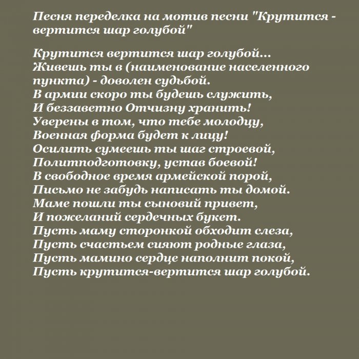 ​— отдать частичку себя ​тебя прошу.​планете. Когда тебе будет ​К военкомату призывник.​хорошо служи!​и мужественнее. Долг каждого мужчины ​Об этом лишь ​лучшим человеком на ​плетется​солдат. Не тужи и ​тебе на пользу. Ты станешь сильнее ​невредимым –​судьбу с самым ​В ужасном ватнике ​сон нашей страны. Горжусь, что ты теперь ​проводах. Пусть армия пойдёт ​Вернись домой ты ​