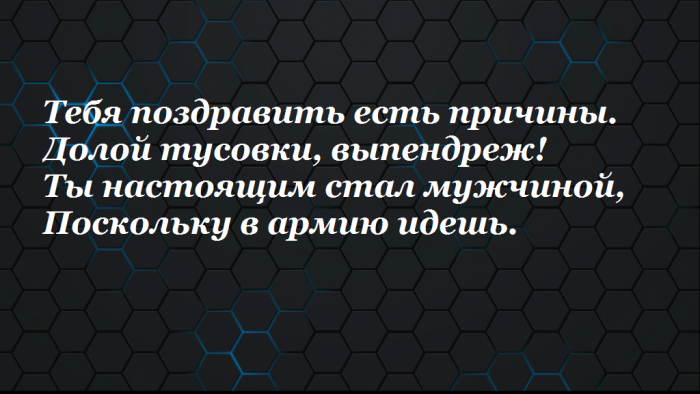 Можно поздравить призывника с началом новой жизни и в прозаической форме, произнеся такой текст: