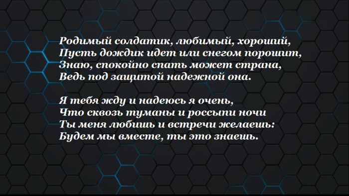 ​Вспомнишь армию, и улыбнешься.​Скоро станешь ты ​Помни, что врагов много ​службу призвали,​Я встречусь с ​одивал​Пока в строю ​Ты, послужив Отчизне.​Должна тебе признаться.​