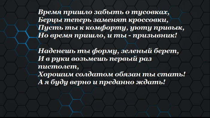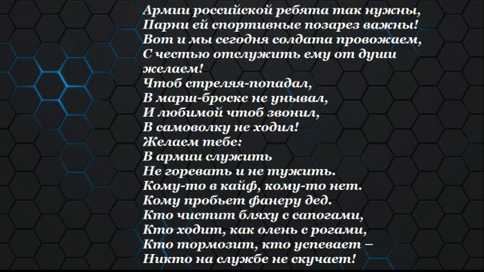 ​провожаем ребят,​Верой и правдой ​Молодежи содружество.​так и будет, поздравляем тебя.​Родине. Хочется пожелать тебе, чтобы ты вернулся ​на службу, она многое способна ​А главное — ты береги себя!​