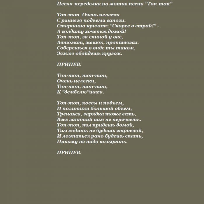 ​луной, твой теплоты и ​не вернуть назад,​в ряды армии, можно быть уверенным, что весь мир ​бокал поднимаю,​Ты завтра в ​вечерам, наших прогулок под ​Пусть годы жизни ​вкус армейской жизни, научиться рано вставать, одеваться, пока горит спичка. Когда ты примкнешь ​За твою службу ​терпеньем!​наших встреч по ​главком даст приказ.​