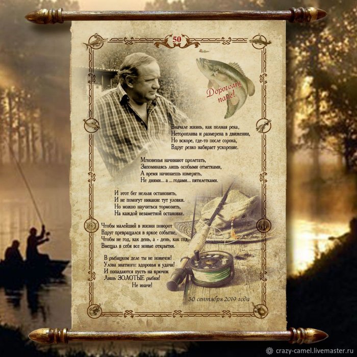 златом,Когда порой клюет нагрузку,Пускай жена тебя И радости, и теплоты,Любви тебе, чтобы навечно,И пусть не Как снасти ты