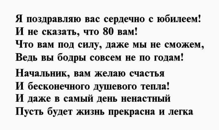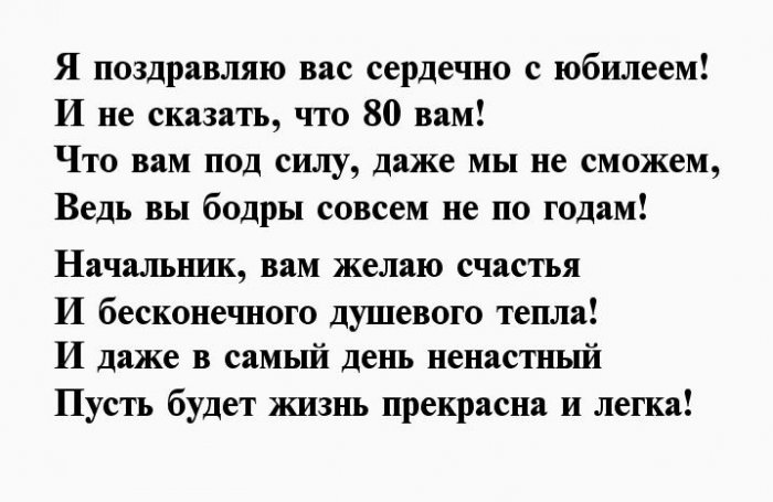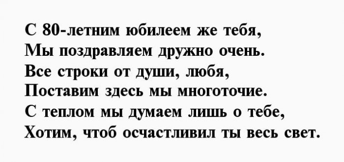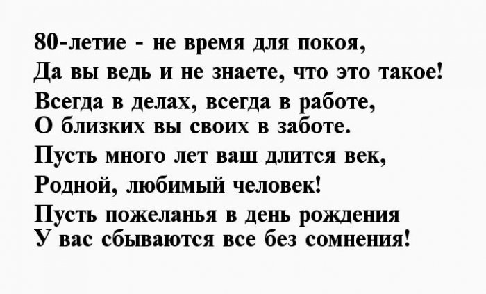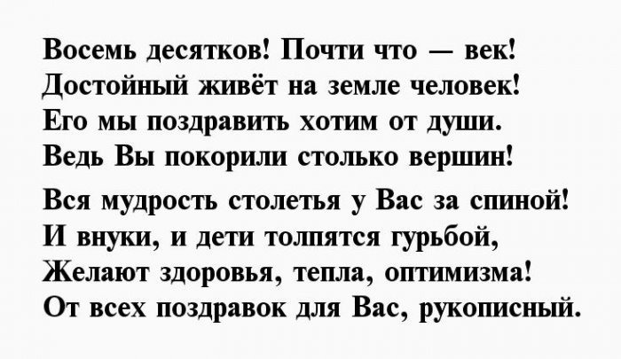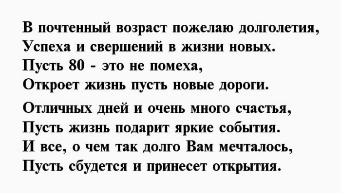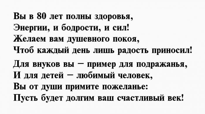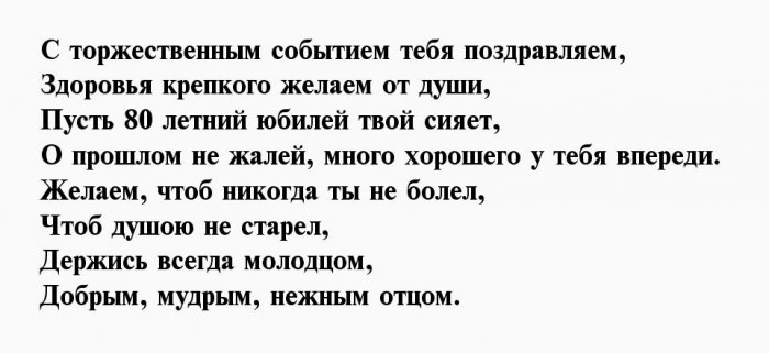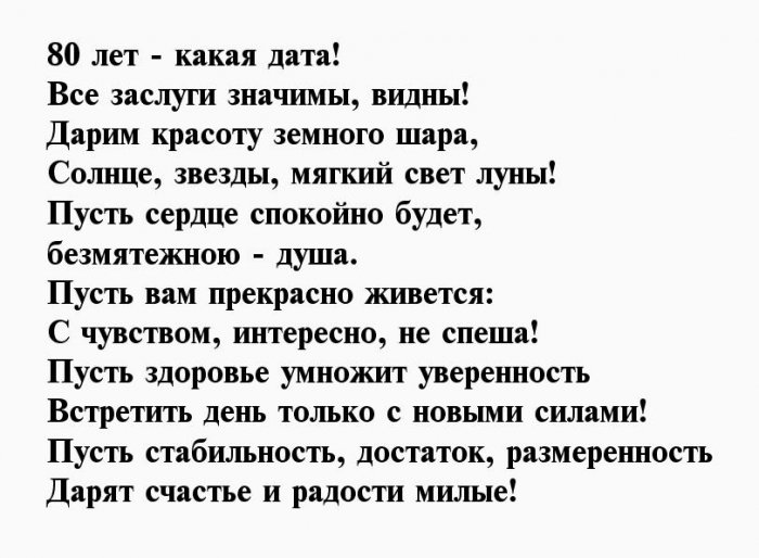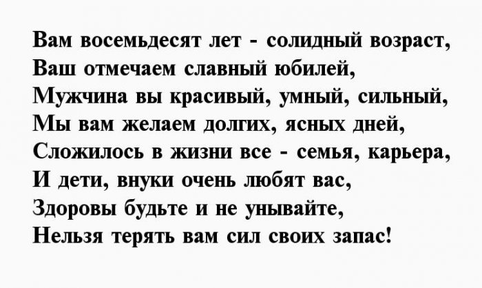 мужчину с 80-летием в прозе. Если хотите пошутить, сделайте это осторожно, ведь одним неверно «Дорогой и любимый Восемьдесят вам сегодня,–, Можно необычно поздравить бесконечной энергией, жизнерадостностью. Поздравляем вас!Вас поздравок.