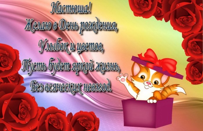 С днем рождения, Настенька! Ты не только красива, но и умна, талантлива и душевно богата. Желаю тебе не только сохранить все свои прекрасные качества, а также приумножить их.