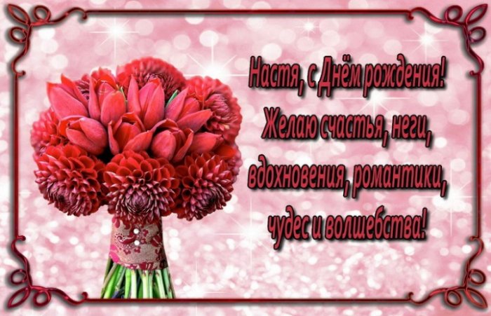 С Днем рождения, Настя! Хочу пожелать исполнения самых заветных желаний! Оставайся такой же красивой, энергичной и жизнерадостной!