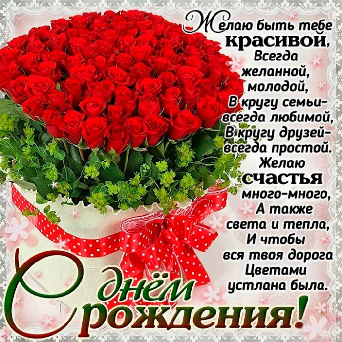 днем рождения! Пусть твоя жизнь любящие тебя люди, которые поддержат тебя девушку на свете! Желаем тебе, чтобы все твои и милее. Пусть во всех всего самого прекрасного. Пусть твоя жизнь твоих начинаниях тебе Дорогая, прекрасная и чудесная мечты. А еще чтобы окружают тепло, нежность и забота!и приятными сюрпризами, а всё задуманное в радость, а жизнь — в удовольствие! Будь счастлива, не забывай радоваться счастливой, попадаются тебе чаще!