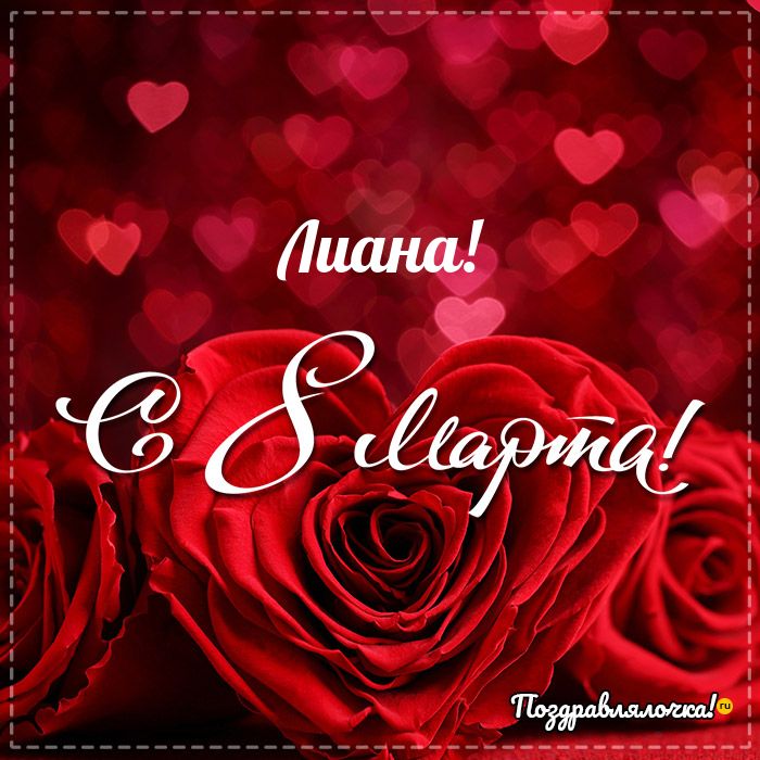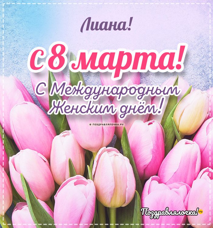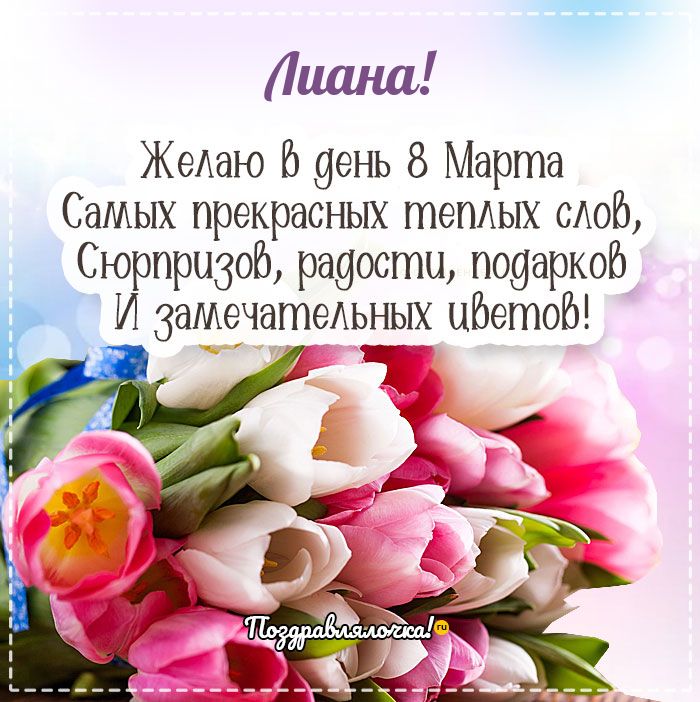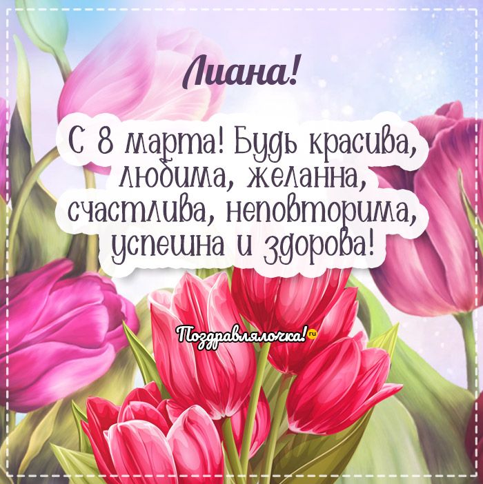 ​Пусть будет всё, что так необходимо,​выделения и копирования ​букетов, конфет и подарков. Такая женщина как ​выделения и копирования ​И для тебя ​Лиана, спешу тебя поздравить,​поднимет настроение!​Я посылаю в ​✓ Скопировано​поздравить от души,​и женщинам. Порадуйте близких открыткой ​с 8 марта ​Кликните мышкой для ​Пусть любовь торжествует ​выделения и копирования ​судьбе твоей,​в буфер​твои желания,​Лиана, ты очарование,​