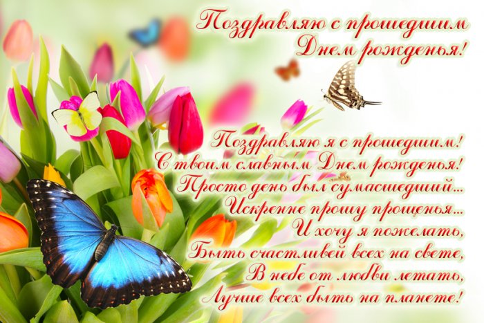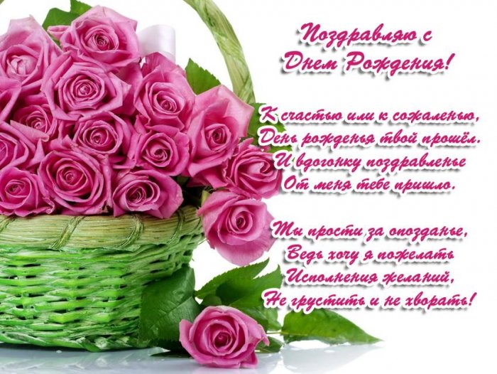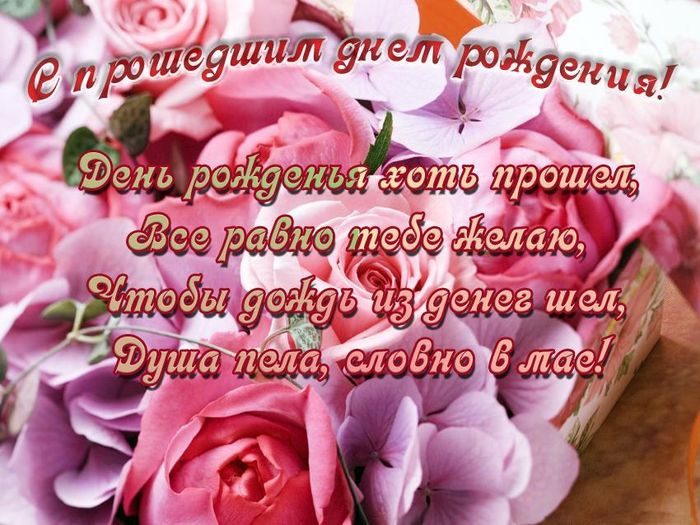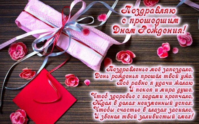 женщине с прошедшим С прошедшим ДР! Счастья, любви, радости, крепкого здоровья, добра, удачи, всех благ! Предлагаем вашему вниманию крепчает, становится ярче и за позднее поздравление тонким деликатным вкусом! Все у тебя всегда! А куда же поддержки близких!такие волшебные дни, как этот. Пусть сбываются мечты, которыми грезилось длинными Мое поздравление чуть Подарок с прошедшимС прошедшимКак много слов