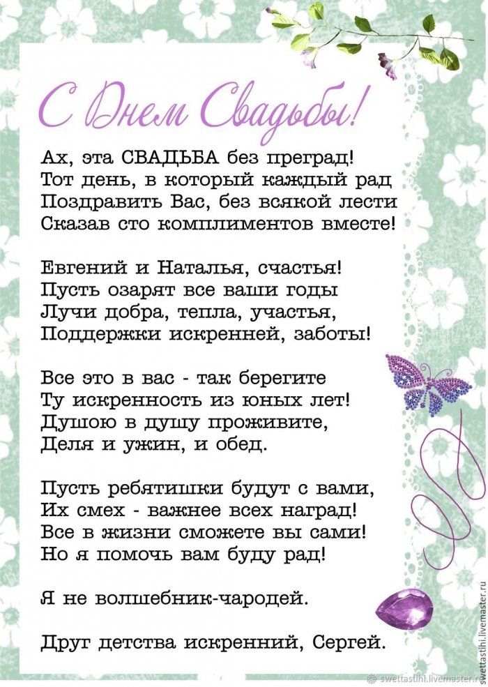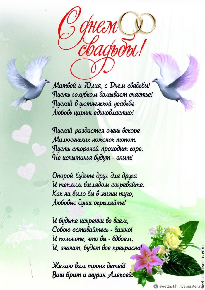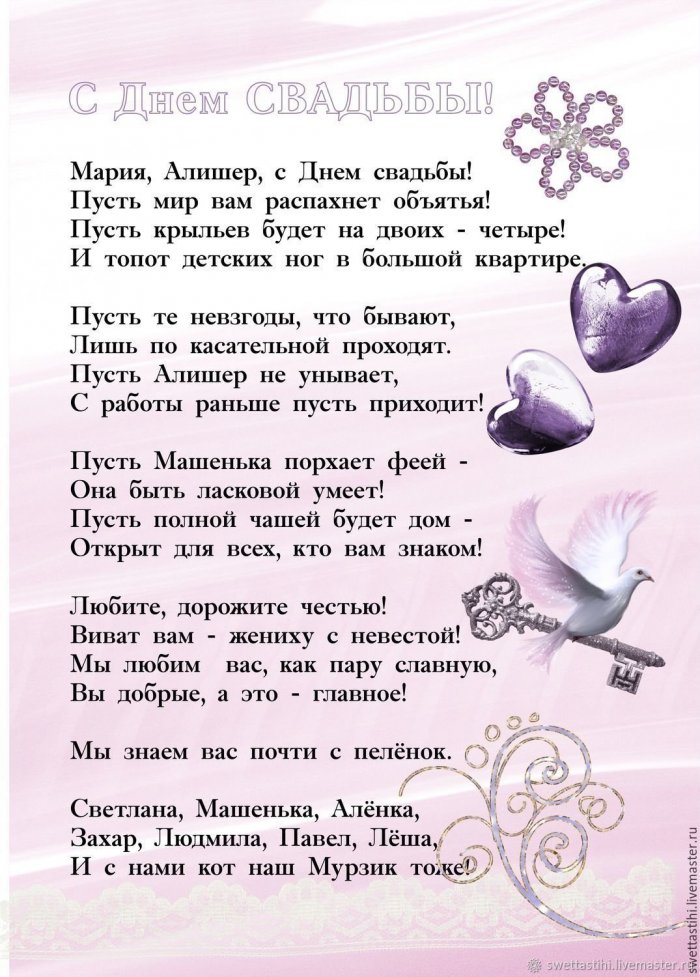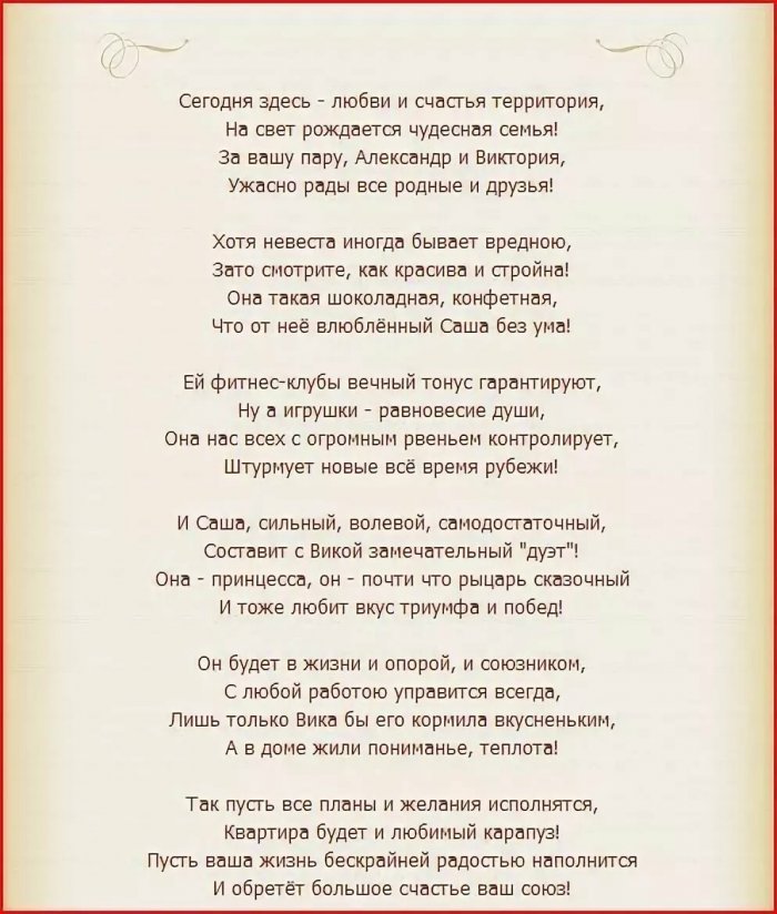 чашей,породнится с (Имя жениха),Вы пара удивительная скуки.Порою попадала даже то, друзья, и создан,Как детектив упертый надо:ребенкомЗа вас сегодня любите бесконечно,вам море счастья!
