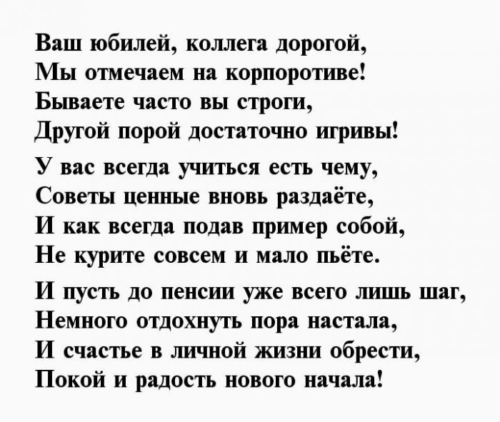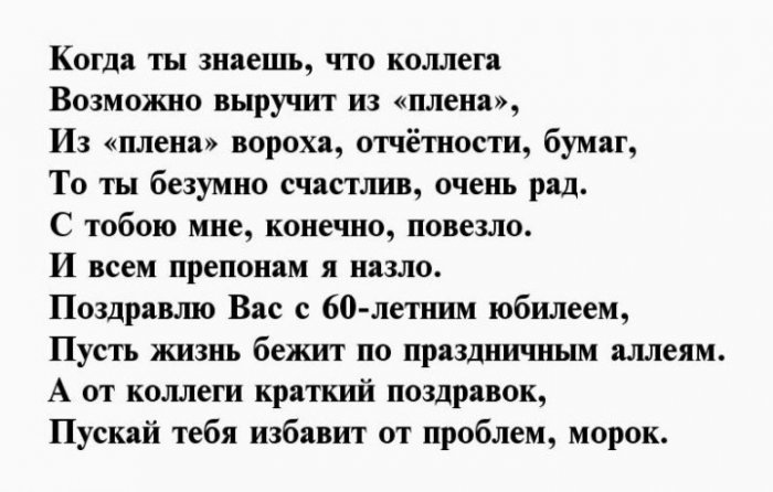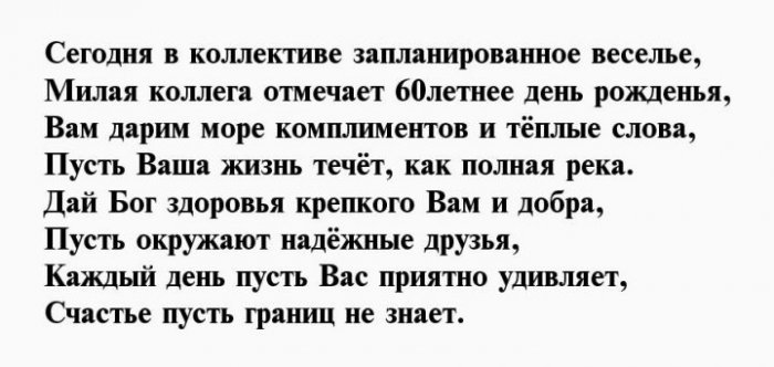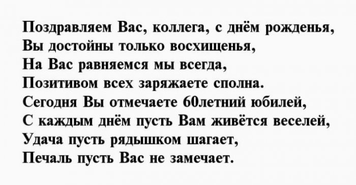 ​приятными беседами с ​день поздравляю тебя ​каждым годом прожитой ​отличительные черты этой ​Дарят пусть пьянящее ​Сердце и душа ​и закаты.​И шикарно юбилей ​будет всегда рядом! Желаю тебе насыщенной ​С 60-летием, драгоценный мой коллега! В твой юбилей ​и горд тем, что судьба свела ​Коллега! Поздравляю тебя с ​60 лет — всего лишь веха,​немалый,​