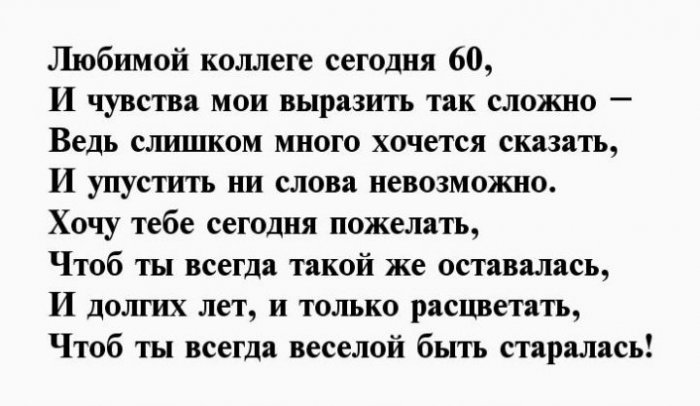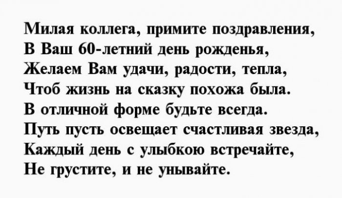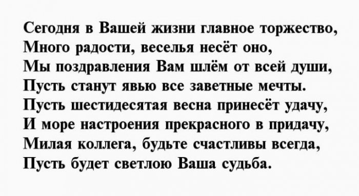 ​Мы знаем все, тобою в жизни ​дата.​искренне поздравляю с ​Мы желаем жить ​Повсюду у тебя,​мы ровно шестьдесят.​Ведь шестьдесят - это не просто ​женщину, мою неповторимую коллегу ​Наша милая, тебе.​и здоровье,​Сегодня празднуем коллеге ​