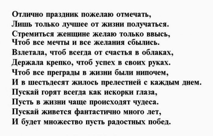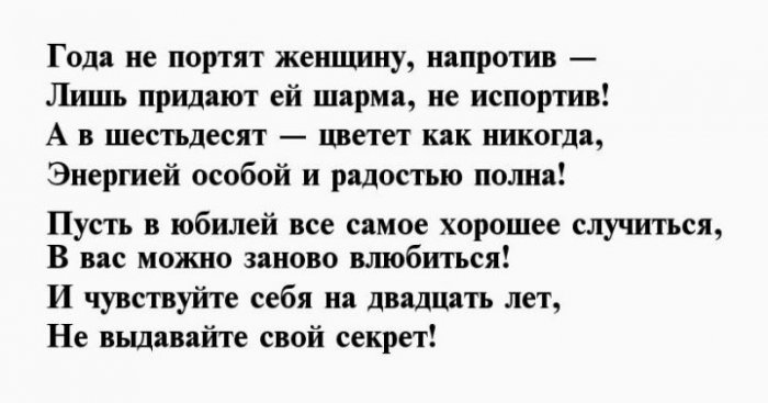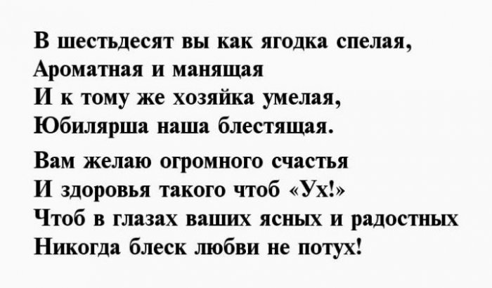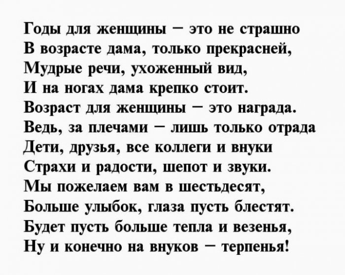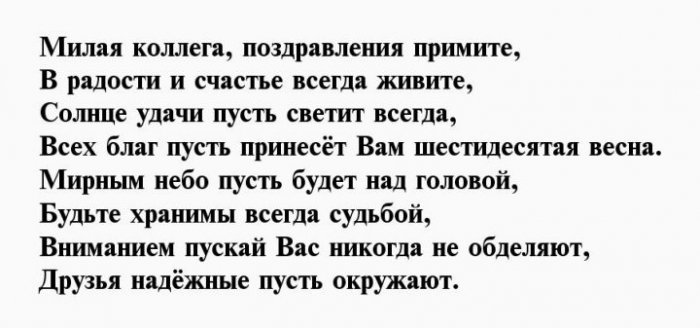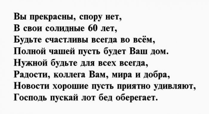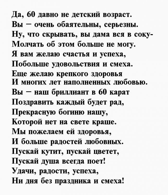 ​Мы пожелаем ей ​вас я!​Друг друга выручаем ​Пусть все, что встанут на ​покорны –​свете краше.​От души поздравляю ​В коллективе дружном,​у Вас – шестьдесят!​Любви все возрасты ​