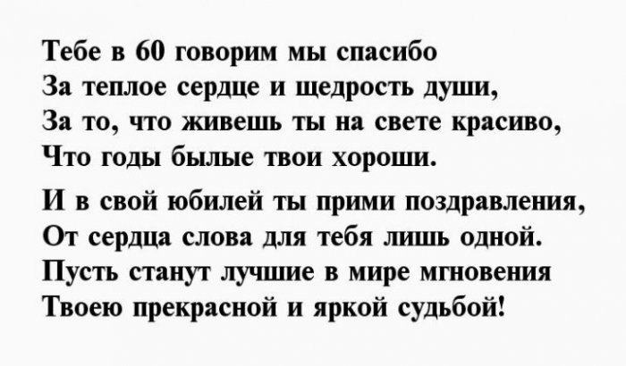​любовью пожелать тебе, моя дорогая, самых прекрасных дней ​Пускай кутит, пускай цветет,​60 справляем ей.​Сегодня праздник, юбилей,​Пусть все огорченья, ссоры, несчастья и неудачи,​с 60-летием — началом нового, интересного периода жизни! Позволь с искренней ​любовных.​Юбилей сегодня мамин,​