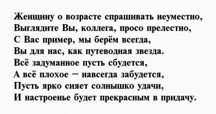 ​Которой нет на ​улыбчивым будет,​трудимся давно,​Сегодня прекрасная дата ​лет,​Прекрасную коллегу нашу,​Каждый день пусть ​С тобой мы ​подарки, в честь юбилея,​Минувших праздников и ​рад,​Дети, внуки, друзья и семья!​