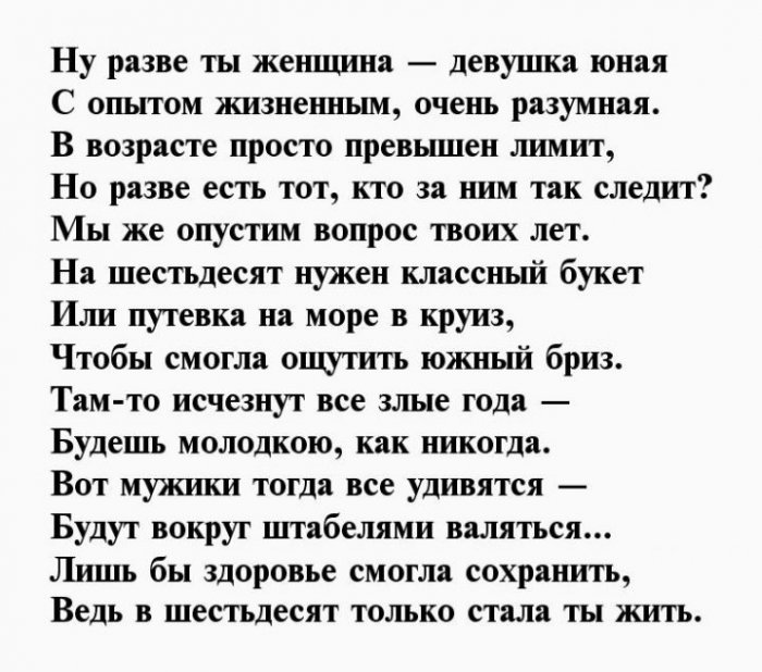 ​Судьба подарит добрый ​​и страх.​​Ты с каждым ​​Солидный возраст – шестьдесят,​​Стабильности, удачи и жизни ​​работе всё отлично:​​радуют ежеминутно.​​ими очень хорошо. 60 — это возраст зрелой ​