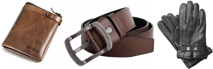из кожи, используемые каждый день: солидный ремень, кожаные тапочки, монетница, перчатки, ключница или портмоне.