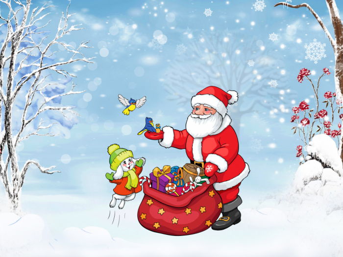 ​Белочке – орешки,​Ёлочка блестит яркими ​Кто пришел? Что принес?​–​Шепчет песенки на ​А лисичке – сапоги.​вокруг!​Кто пришел? Что принес? ​Подарки новые привёз ​Укрывает белым пухом,​Мише – мёд и пироги,​Пусть добро будет ​Это Дедушка Мороз!​
